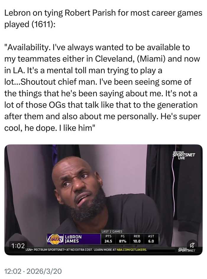 “关键在于出勤率。无论是在克利夫兰、迈阿密还是现在的洛杉矶,我一直希望能为队友保持上场状态。长期保持高出场数对精神是种消耗……致敬这位传奇。我注意到他近期对我的评价。很少有元老级人物能这样真诚地与后辈交流,特别是对我个人而言。他非常酷,很了不起,我十分尊敬他。”