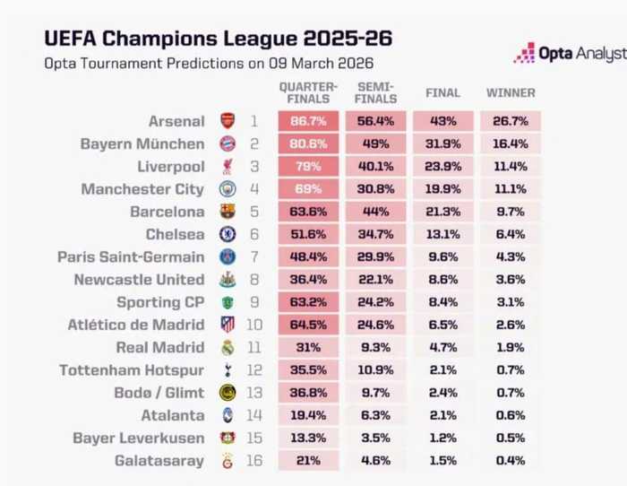 Opta预测欧冠16强晋级1/4决赛概率: