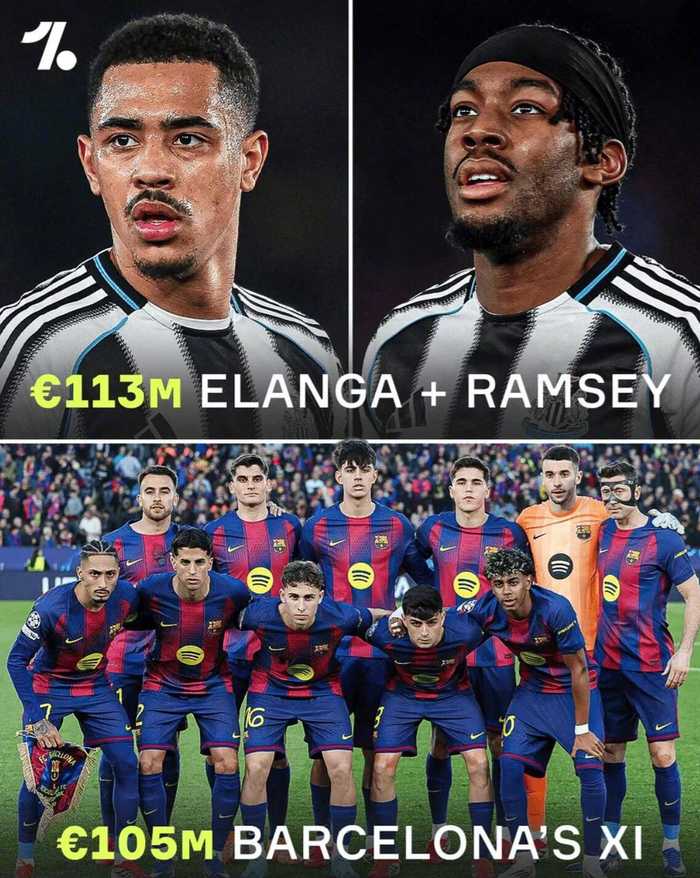 赛后OneFootball晒出对比图:本场巴萨首发11人的总转会费约为1.05亿欧元,而纽卡今夏引进埃兰加和雅各布-拉姆齐两人的总花费约为1.13亿欧元。