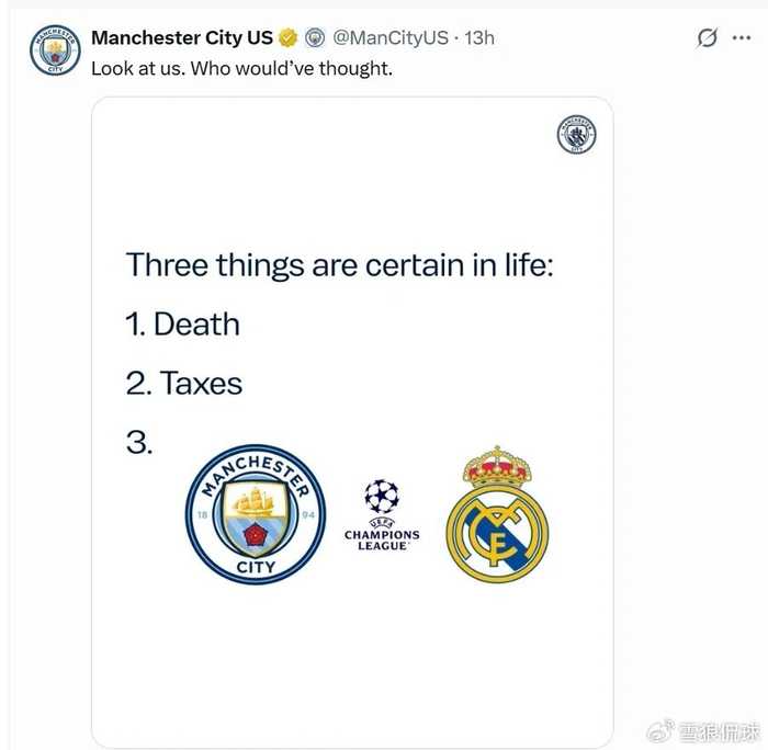 北京时间2月28日凌晨,曼城官方社交媒体发文晒出了一张图片,并配以“看看我们,谁能想到呢”的文字。而图片中则写道:“人生中有三件事是注定的,1、死亡;2、税收;3、曼城vs皇马”。
